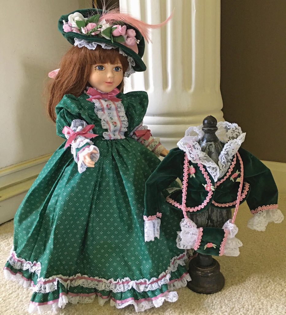 Plain Jane does not look plain any longer, dressed in a lovely emerald green, floor-length dress trimmed with pink ribbons and delicate lace. Her hat is a deep green velveteen that matches her lace-trimmed jacket and charming muff.